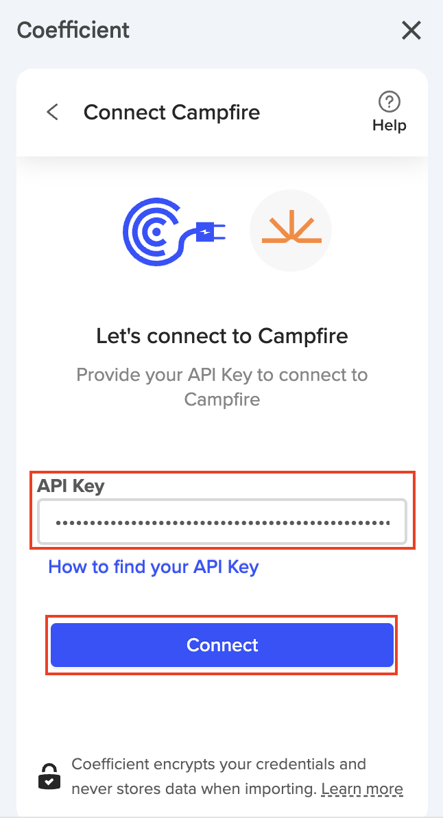 4. Campfire will generate a new API Key for you. Copy the Key and paste it into the API Key text box from the Coefficient connection screen. Click the “Connect” button (blue) in the Coefficient sidebar to establish your connection. (Step 4 below)