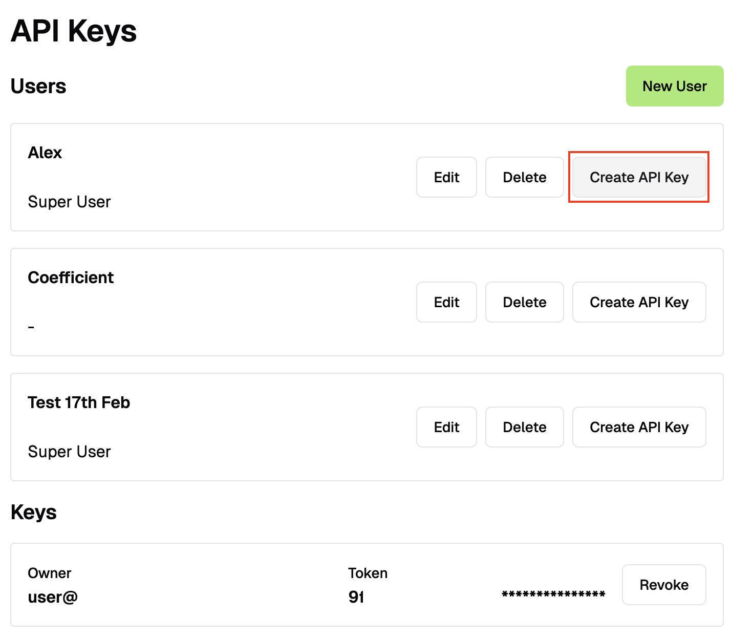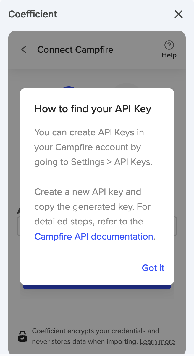 Before you can create a connection in Coefficient, you’ll first need to generate your API Key in Campfire.