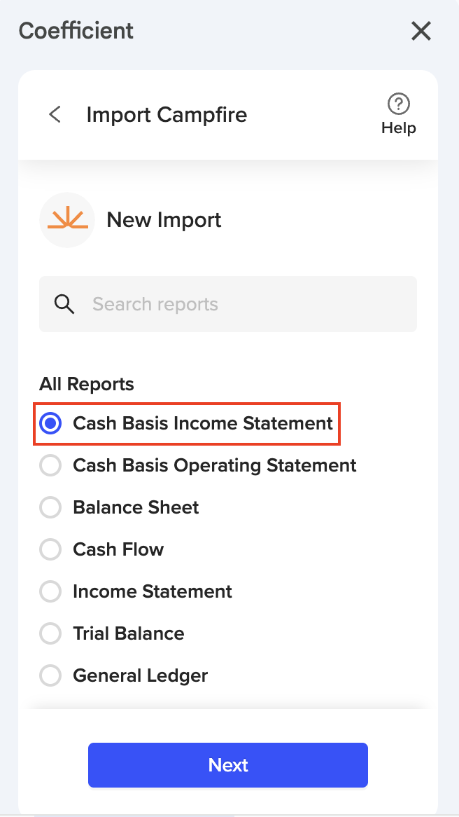 3. Select the report to import. e.g., "Cash Basis Income Statement"