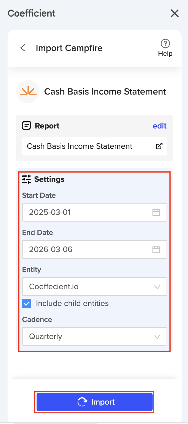 4. Modify the import settings by selecting the Start Date, End Date, Entity, and Cadence. (optional) Tick the "Include child entities" box to include subsidiary data. Once completed, click Import. |