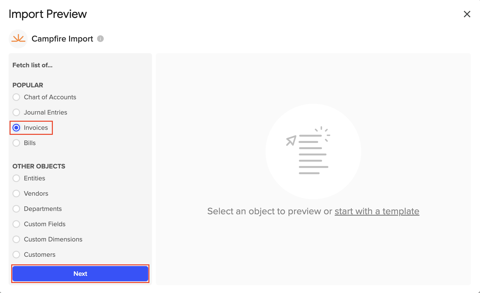 3. Select the object from Campfire you'd like to import from and click "Next". (e.g., Invoices)