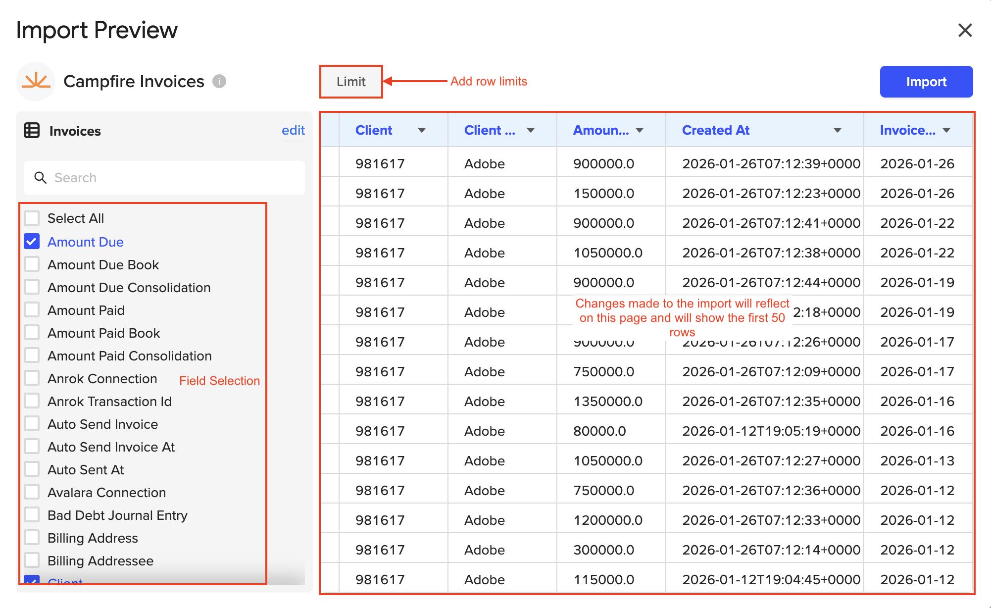 4. Select the fields you would like to include in your import (a blue checkmark will appear on the selection). You can also limit the rows that will be imported. Any changes to the field selection will appear on the preview, showing the first 50 rows.