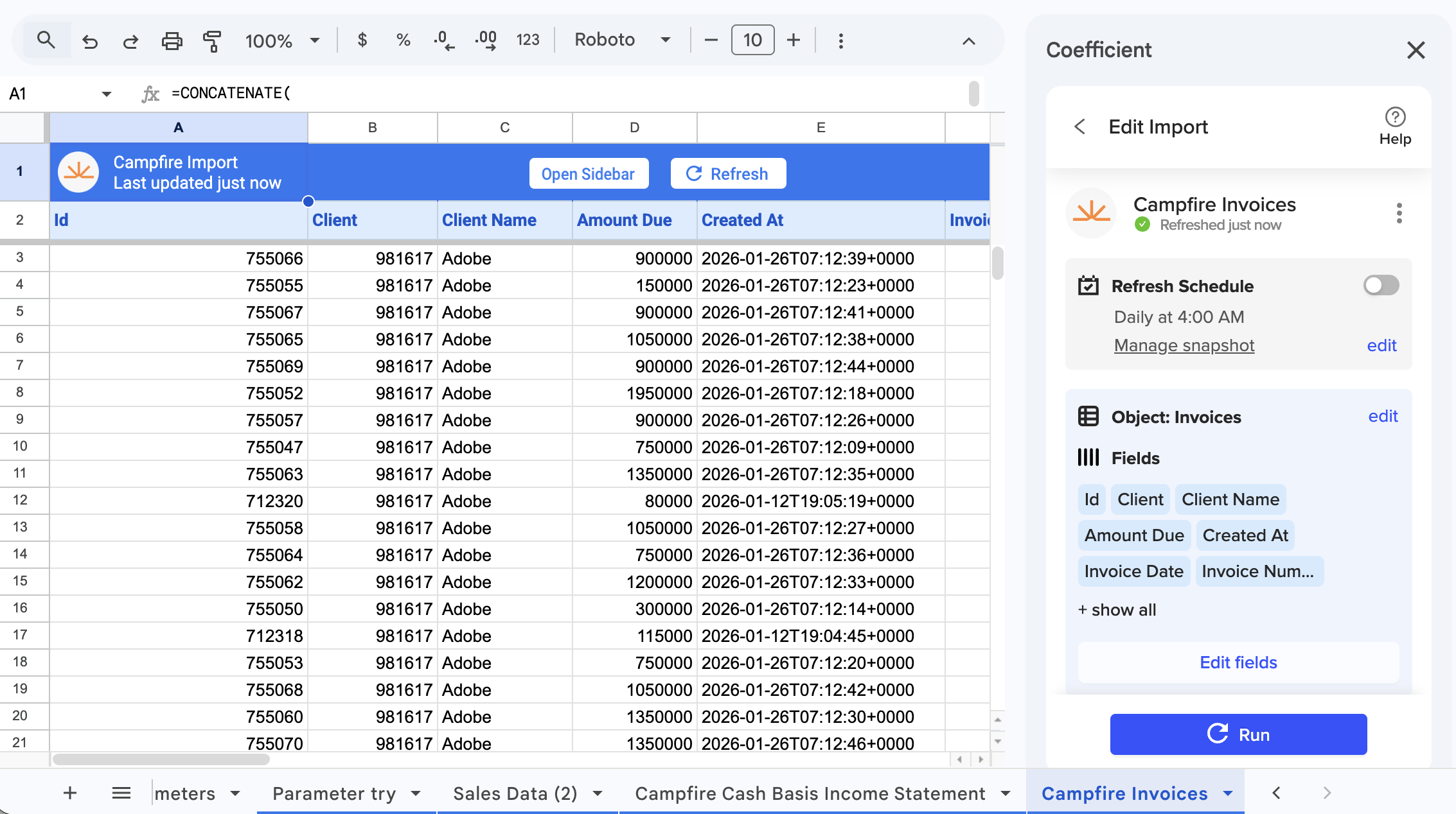 5. Congratulations on importing a Campfire Report with Coefficient! 🎉