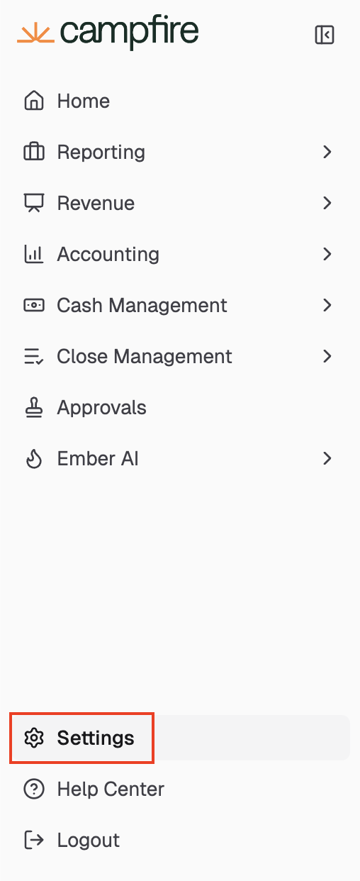 1. From the Campfire (UI) menu on the left side of the homepage, navigate to Settings. |