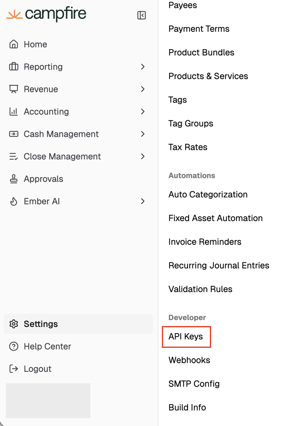 ℹ️ NOTE: If an API Key is not yet created for the account, it needs to be created from the Campfire platform by going to Settings > API Keys. Refer to the Campfire API documentation for more information. |