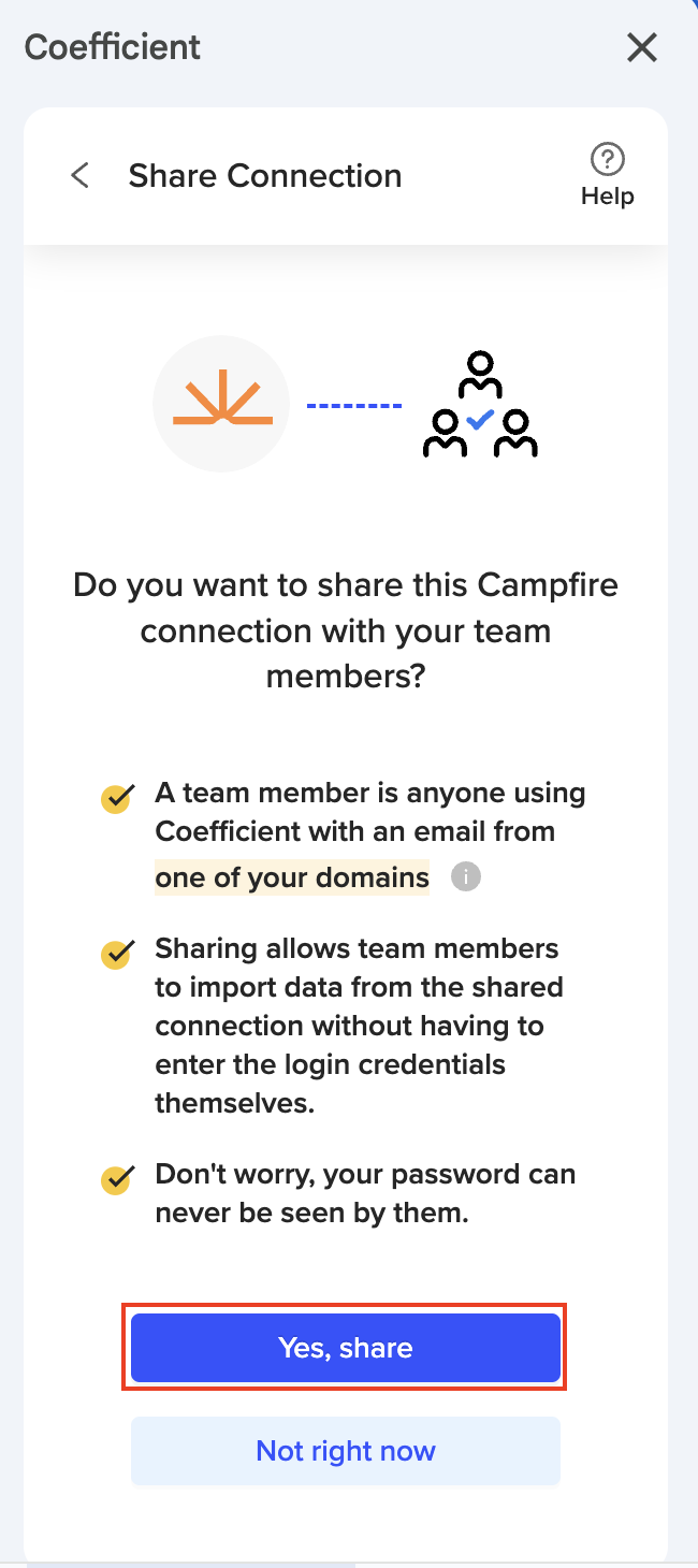 OPTIONAL: Once the connection is made, you will see an optional setting allowing you to share your Campfire connection with your team. Your password will never be visible to your team members. |