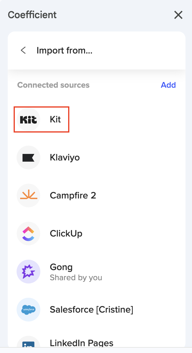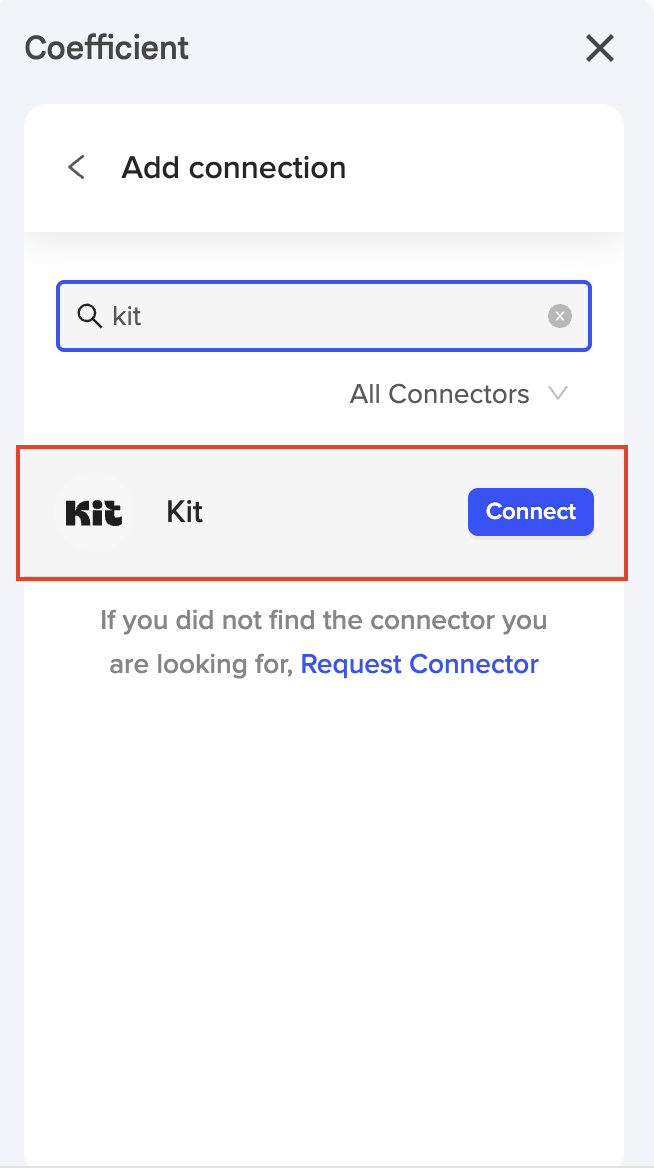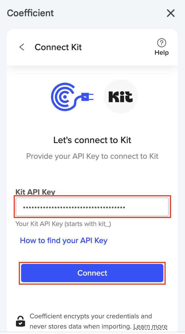 When you begin a Kit import for the first time, you will need to go through a few steps to connect to Kit as a data source for Coefficient.