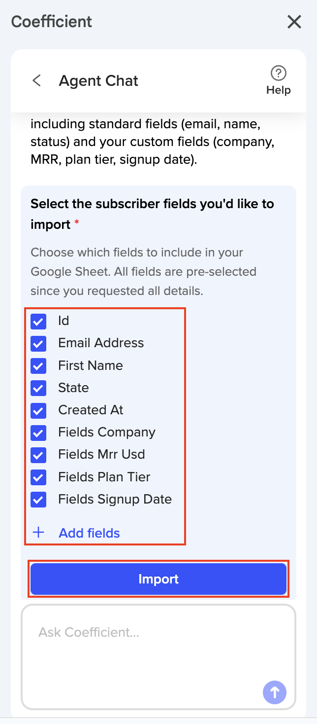 4. Fields relating to your request will appear in the sidebar for your to select/unselect to include in your import. Click on "Add fields" to show all available fields. Click "Import" to proceed. |