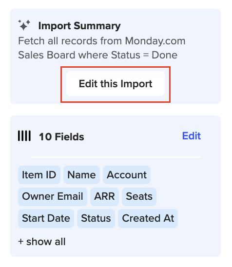 To edit your import, open it from the sidebar and click “Edit this import” under the summary section (see screenshot). From there, enter a new prompt in the agent chat describing the updates you’d like to make (such as adding filters or adjusting sorting). |