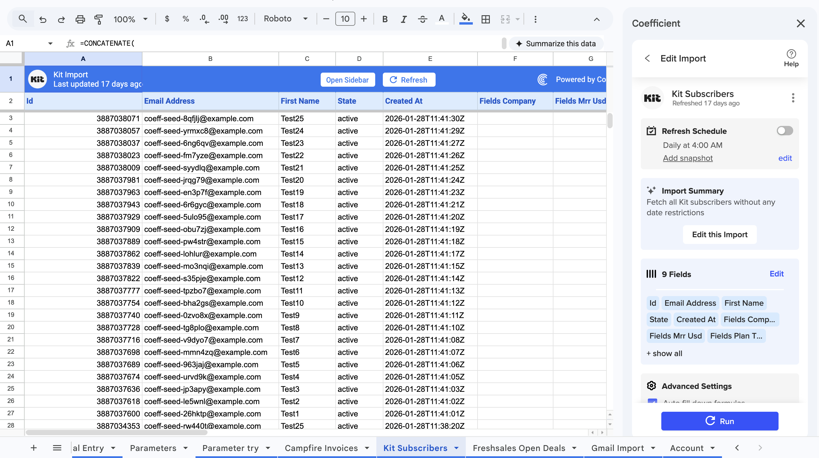 Coefficient's Kit connector allows users to experience real-time syncing of subscriber information directly to Google Sheets without manually exporting from Kit. You can monitor and pull in subscriber data such as email addresses, tags, subscriber status, broadcasts, and others that can be automatically written to a spreadsheet using our AI Connector. 🦾