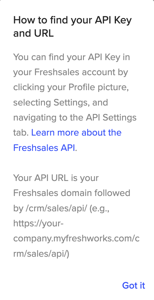 4. Generate an API Key for your account in Freshsales. ℹ️ NOTE: If an API Key is not yet created for your account, it needs to be created from the Freshsales platform. Please see the Freshsales API documentation for details. |