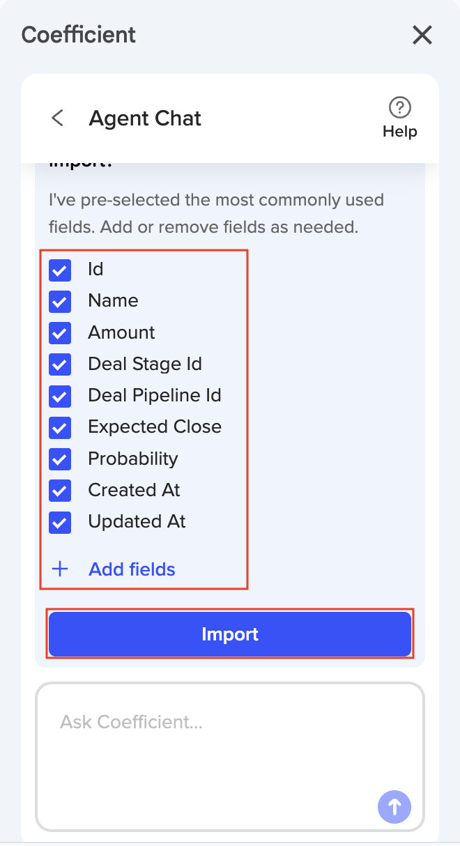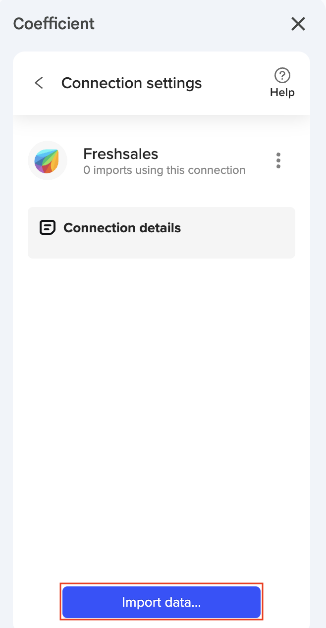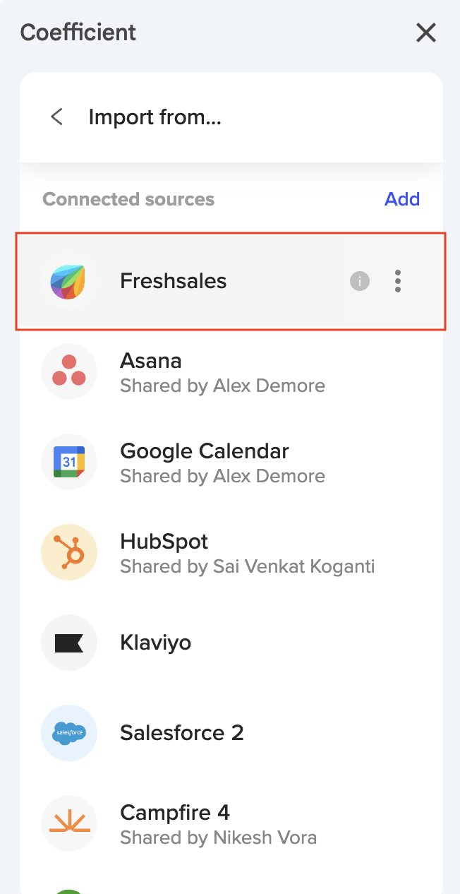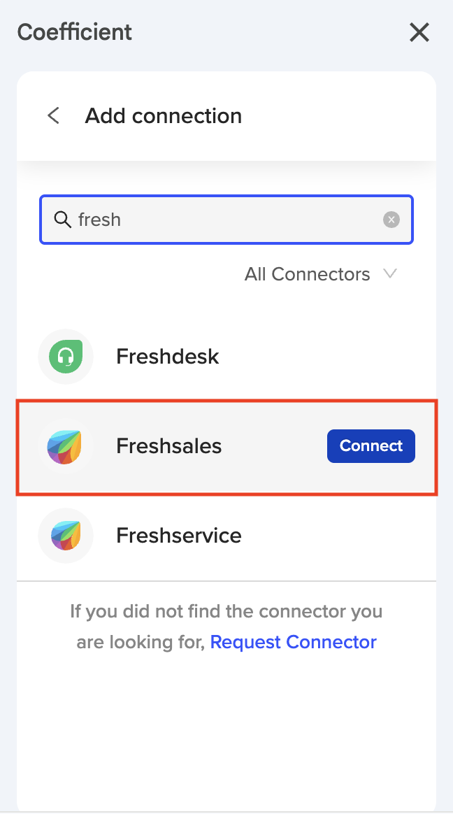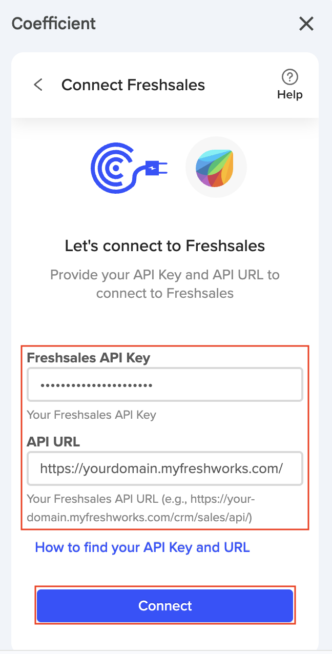 When you begin a Freshsales import for the first time, you will need to go through a few steps to connect to Freshsales as a data source for Coefficient.